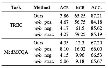 이는 정확하게 예측된 샘플을 유지하고 전반적인 작업 성능을 향상시키는 데 있어 긍정적인 경험의 중요한 역할을 강조합니다. 또한 표 1과 비교한 결과, 긍정적인 경험과 전략만 활용할 때 STRAGO가 성능을 효과적으로 최적화하여 TREC 작업의 모든 기본 방법을 지속적으로 능가할 수 있는 것으로 나타났습니다. 반대로 부정적인 경험을 제거하면 BCR이 감소하여 이러한 경험이 잘못된 샘플을 수정하고 잘못된 예측 데이터의 하위 집합에 적응하는 데 중요한 정보를 제공한다는 것을 알 수 있습니다. 이러한 경험이 없으면 프롬프트를 효과적으로 수정할 수 있는 옵티마이저의 능력이 저하되어 이 데이터 하위 집합과 관련된 중추적인 텍스트의 통합을 방해합니다.