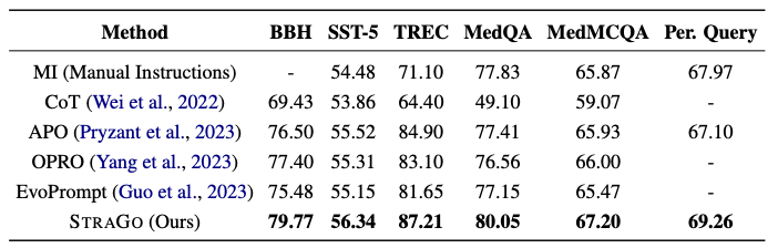 3. 다양한 작업에 걸친 광범위한 검증: 추론, 언어 이해, 도메인별 지식, 산업 애플리케이션 등 다양한 작업에 걸쳐 STRAGO를 광범위하게 평가하여 STRAGO가 신속한 최적화에서 최첨단 성능을 달성한다는 것을 입증합니다.