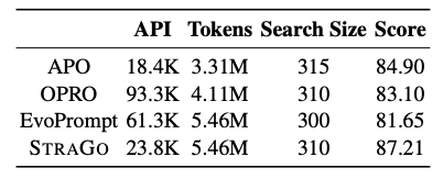 그림에서 볼 수 있듯이 APO는 API 호출이 가장 적고 STRAGO가 그 뒤를 잇습니다. 이 두 가지 방법 모두 OPRO 및 EvoPrompt와 달리 UCBandit 알고리즘을 활용하여 많은 후보 프롬프트를 필터링하므로 검증 세트에 대한 평가 비용을 절감할 수 있습니다.