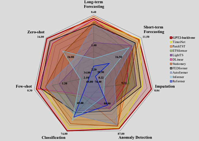 그림 1과 같이 자연어/이미지에 대해 사전훈련된 모델이 모든 주요 시계열 분석 작업에서 비슷하거나 최고 성능으로 이어진다는 것을 보여준다.