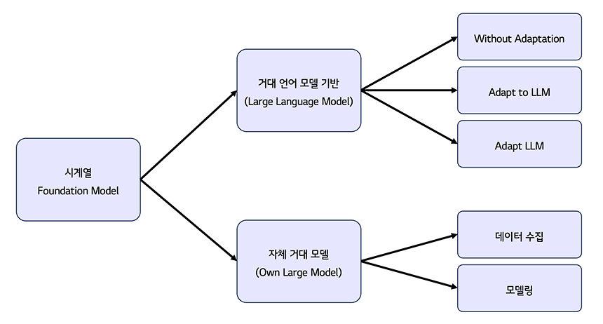 최근까지의 시계열 Foundation 모델 연구를 살펴보면, 크게 거대 언어 모델(Large Language Model, LLM)을 활용하는 방법론과, 시계열을 위한 자체 거대 모델을 고안하는 방법론으로 분류할 수 있습니다. (그림 1) 거대 언어 모델 기반의 방법론은 어떻게 거대 언어 모델을 활용하는지에 따라 1) Without Adaptation, 2) Adapt LLM, 3) Adapt to LLM 3가지로 분류됩니다. 그리고 자체 언어 모델을 구축하려는 연구에서는 거대 시계열 데이터를 수집하기 위한 노력과, 다양한 시계열 데이터를 학습하기 위한 하나의 통일된 모델을 만들려는 노력이 존재합니다.