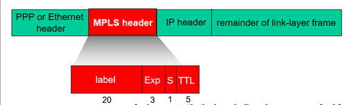 ⤷MPLS 헤더에는 레이블, 실험을 위해 예약된 3개의 비트, 일련의 ‘스택된’ MPLS 헤더들의 끝을 나타내는 1개의 S비트, 생존시간 필드가 있다.