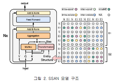 SSAN은 문서에서 나타나는 다양한 종류의 멘션의 의존성(개체명 및 상호참조해결 정보)을 엔티티 구조(Entity structure)로 표현하고 이를 Self-attention 메커니즘 내에서 이러한 멘션의 의존성을 모델링하였다[2]. SSAN의 가장 큰 특징인 엔티티 구조(Entity structure)는 다음과 같이 정의된다: 1) Intra + coref : 동일한 문장 내에서의 동일한 엔티티 2) Intra + relate : 동일한 문장 내에서의 함께 출현한 엔티티 3) Inter + coref : 동일하지 않은 문장에서 출현한 동일한 엔티티 4) Inter + relate : 동일하지 않은 문장에서 관계가 있는 엔티티 5) IntraNE : 동일한 문장 내에서 함께 출현하고 엔티티가 아닌 것 6) NA : 동일하지 않은 문장에서 엔티티가 아닌 것 (중요하지 않다고 판단한다.) SSAN은 문서 수준 관계 추출을 위해 위에서 정의된 엔티티 구조를 이용하여 Self-attention 메커니즘 내에 바이어스 값을 더해주어 멘션 간의 의존성을 모델링한다.