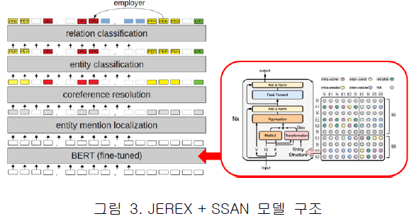 기존의 JEREX는 4개의 작업 요소(1. 엔티티 멘션 추출, 2. 상호 참조 해결, 3. 엔티티 분류, 4. 관계 분류)로 구성되며 이를 End-to-end 방식으로 공동 학습(Joint learning)한다. 하위 구성 요소에 단일 BERT 인코더를 공유하는데, 이 부분에 사전에 정의해 놓은 Structured Self Attention Network가 들어가서 BERT의 Self-Attention이 수행될 수 있도록 했다. JEREX의 학습에는 기존에 사용되었던 DocRED 데이터 셋을 사용하였으며, SSAN의 입력으로는 DocRED 데이터 셋에 외부 언어 분서기인 spaCy를 수행하여 얻은 오류가 포함된 개체명 인식 및 상호 참조 해결 결과를 사용하였다.