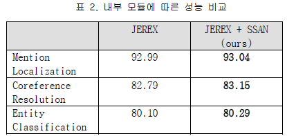표 2는 JEREX의 3개의 작업 요소인 엔티티 멘션 추출(Mention Localization), 상호 참조 해결(Coreference Resolution), 엔티티 분류(Entity Classification)의 개별 성능을 나타낸다. 기존 JEREX 모델에 외부 언어 분석기(spaCy)의 오류가 포함된 분석 결과를 SSAN을 통해 입력해 준 JEREX+SSAN 모델이 모든 작업 요소에서 성능이 향상되는 것을 볼 수 있다. 이는 오류가 포함된 외부언어분석기(spaCy)의 분석 결과 정보가 JEREX의 3개 작업 요소에 도움이 되기 때문이라고 판단된다.