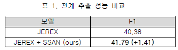 표 1은 Joint Learning을 사용한 관계 추출 모델인 JEREX와 JEREX에 SSAN를 결합한 모델의 평가셋에서의 관계 추출 성능을 나타낸다. 본 논문에서 제안한 JEREX+SSAN 모델의 성능이 JEREX 모델의 성능보다 1.41% 높은 것을 볼 수 있다.
