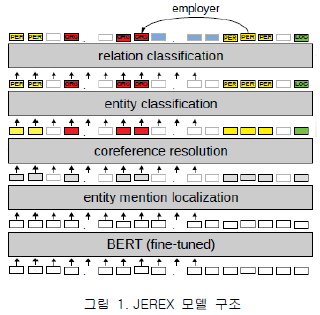 JEREX는 개체명 인식과 상호참조해결, 엔티티 수준의 관계 추출을 결합한 다중 작업(multi task) 모델이다[1]. 이 모델은 문서 수준 관계 추출 데이터인 DocRED와 상호 참조 클러스터 정보를 사용하여 개체명 인식과 상호참조해결, 관계 추출을 동시에 학습하고 수행하는 Joint Learning 기술을 이용하였다.