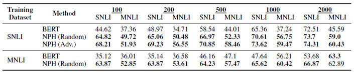 적대적: 여기서 우리는 NPH 모델이 잘못된 예측을 하는 훈련 데이터 세트에서 해당 인스턴스를 선택한다. 이는 모델을 속이는 사례가 수집되는 적대적 데이터 수집 전략(Nie et al., 2020; Kiela et al., 2021)과 유사하다. 여기서 우리는 NPH 모델을 단순히 적대적 사례와 미세 조정하지 않는다. 이는 치명적인 망각을 초래할 수 있기 때문이다. 생성된 PHL 삼중항으로부터 무작위로 샘플링된 인스턴스 2만 개를 포함시키고 결합된 데이터 세트에서 미세 조정함으로써 이를 해결한다. 500개의 인스턴스로 SNLI와 MNLI에서 각각 70.85%, 58.46%로 성능을 더욱 향상시킨다.