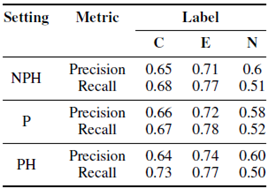 NPH-설정: 우리는 COCO, ROC 및 Wikipedia의 세 가지 원시 텍스트 소스를 사용하여 전제 풀을 컴파일한 다음 해당 전제에서 PHL 삼중항(PHL tripet)을 생성한다. 표 2는 이 설정에서 모델의 정확도를 보여줍니다. 우리는 NLI 모델을 훈련시키기 위해 동일한 수의 PHL 삼중항(150k 클래스 균형)을 사용한다.