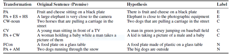 하이퍼닉 치환(HS): 단어의 하이퍼닉은 슈퍼타입이며, 예를 들어 "동물"은 "개"의 하이퍼닉이다. 우리는 WordNet(Miller, 1995)을 사용하여 하이퍼닉스를 수집하고 문장의 명사를 해당 하이퍼닉스로 대체하여 수반 가설을 만든다. 예를 들어 "검은 개가 자고 있다"는 전제로부터 "검은 동물이 자고 있다"를 만들어낸다. 이 경우 전제와 가설을 교환하면 '중립' 관계를 갖는 또 다른 PH 쌍을 제공한다는 점에 유의하십시오.