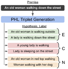 레이블이 지정된 교육 데이터의 부재를 보완하기 위해, 우리는 일련의 문장 변환을 활용하고 NLI 모델 교육에 사용할 수 있는 PHL 삼중항들을 절차적으로 생성한다. P 및 PH 설정에서, 우리는 제공된 전제 문장에 이러한 변환을 적용한다. 전제가 제공되지 않는 NPH 설정에서, 우리는 다양한 원시 텍스트 말뭉치에서 문장을 추출하고 이러한 변환을 적용하여 PHL 삼중항체를 생성한다.