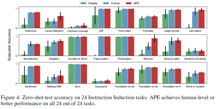 제안된 방법인 APE는 24/24 지침 유도 및 17/21 빅벤치 작업에 대한 모델 생성 지침을 통해 제로샷 학습에서 인간 수준의 성능을 달성합니다.