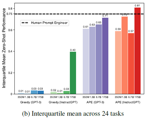 그림 1: (a) 우리의 방법인 Automatic Prompt Engineer(APE)는 출력 데모를 통해 지정된 작업에 대한 명령을 자동으로 생성합니다. 직접 추론 또는 의미론적 유사성에 기반한 재귀 프로세스를 통해 여러 명령 후보를 생성하고 대상 모델을 사용하여 실행합니다, 계산된 평가 점수를 기반으로 가장 적합한 명령을 선택합니다. (b) Honovich et al. (2022)에 의해 도입된 24개의 NLP 작업에 대한 사분위간 평균에 의해 측정된 바와 같이, APE는 Instruct GPT 모델을 사용할 때 인간의 성능을 능가할 수 있습니다(Ouyang et al., 2022).