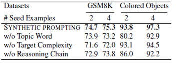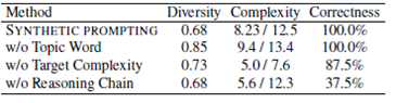 역방향 합성에서, 우리는 LLM에게 주제, 대상 복잡성 및 샘플링된 추론 체인에 대해 조건부 질문을 샘플링할 것을 요청합니다. 질문 합성에 대한 각 조건의 영향을 분석하기 위해 프롬프트에서 해당하는 줄을 제거했습니다. 특히, 대상 복잡성을 제거할 때 추론 단계의 숫자 마커도 제거됩니다. 표 3에서 볼 수 있듯이, 어떤 조건이라도 제거하면 GSM8K와 유색 물체 모두에서 모델 성능이 저하됩니다.
