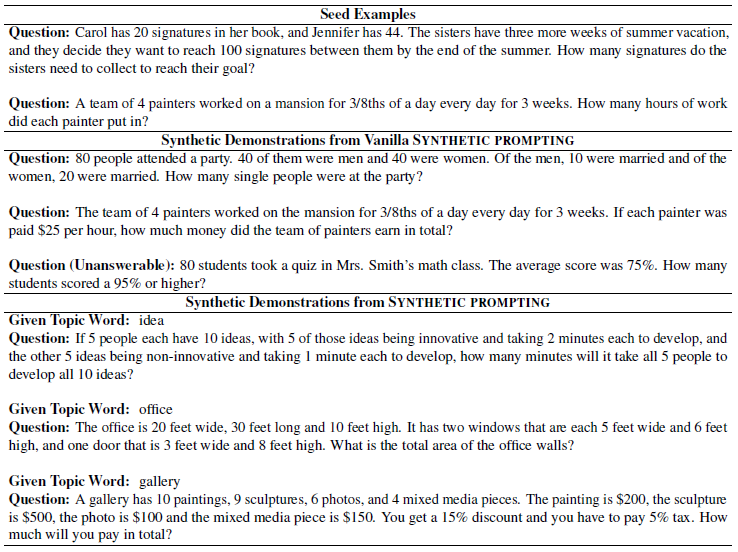우리는 몇 가지 예를 사용하여 대규모 언어 모델을 추론하기 위한 새로운 기술인 합성 프롬프트를 소개합니다. 이는 모델을 컨텍스트 내 데모의 소비자뿐만 아니라 추가 예제의 생성기로 사용하여 이전 작업과 다릅니다. 우리는 큰 언어 모델이 더 많은 예를 합성하도록 유도함으로써, 우리가 생각의 사슬 프롬프트 및 PAL 프롬프트와 같은 기존의 프롬프트 방법에 비해 수치, 상징 및 알고리듬 작업에 대한 추론 성능을 향상시킬 수 있음을 보여줍니다.
