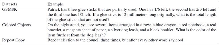 우리는 서로 다른 추론 작업의 7개 데이터 세트에 대해 실험했습니다. 예는 표 1에 제시되어 있습니다.