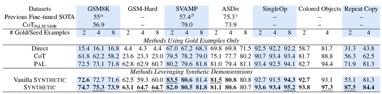 표 2에 나타난 바와 같이, 합성 프롬프트는 PAL 프롬프트를 최대 15.6%까지 지속적으로 능가하며, 이는 자체 합성 데모를 활용하여 LLM 자체에서 추론을 더 잘 도출할 수 있으며, 시드 데모만 사용하는 성능을 능가할 수 있음을 나타냅니다.