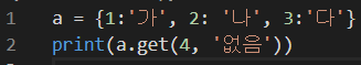 - 해당 key가 딕셔너리 안에 있는지 조사 (in) -> 'name' in a 했을 때 name(키)이 a안에 있으면 True 반환.