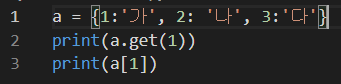 - 딕셔너리 요소 삭제하기 -> del 함수 사용 -> del a[1], 여기서 1은 키임.