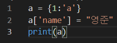 - 딕셔너리 쌍 추가하기 -> 새로운 키를 할당할 수 있다.